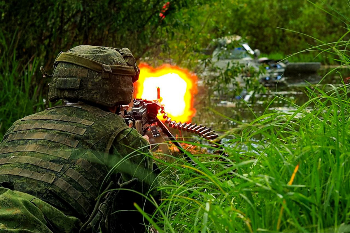На фоне созданной тактической обстановки экипажи БТР-82А форсировали реку Березину под огнем условного противника, который по тактической обстановке занял противоположный берег.