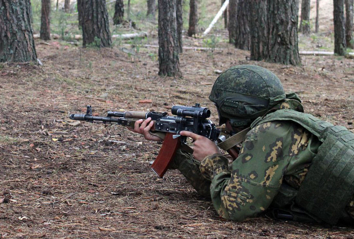 Военнослужащие 11-й отдельной гвардейской механизированной бригады отрабатывают приемы ведения боя в лесу.