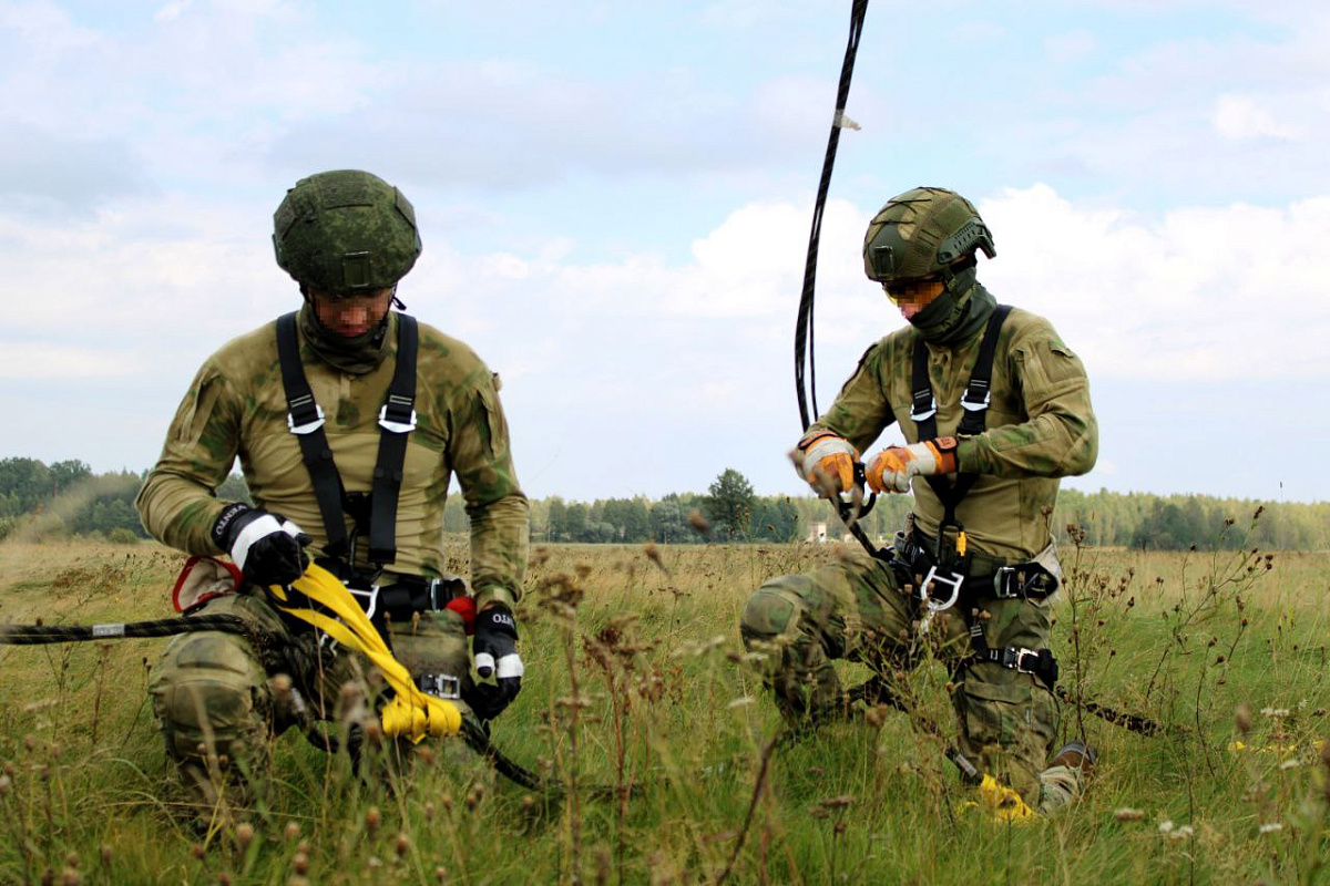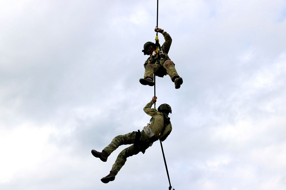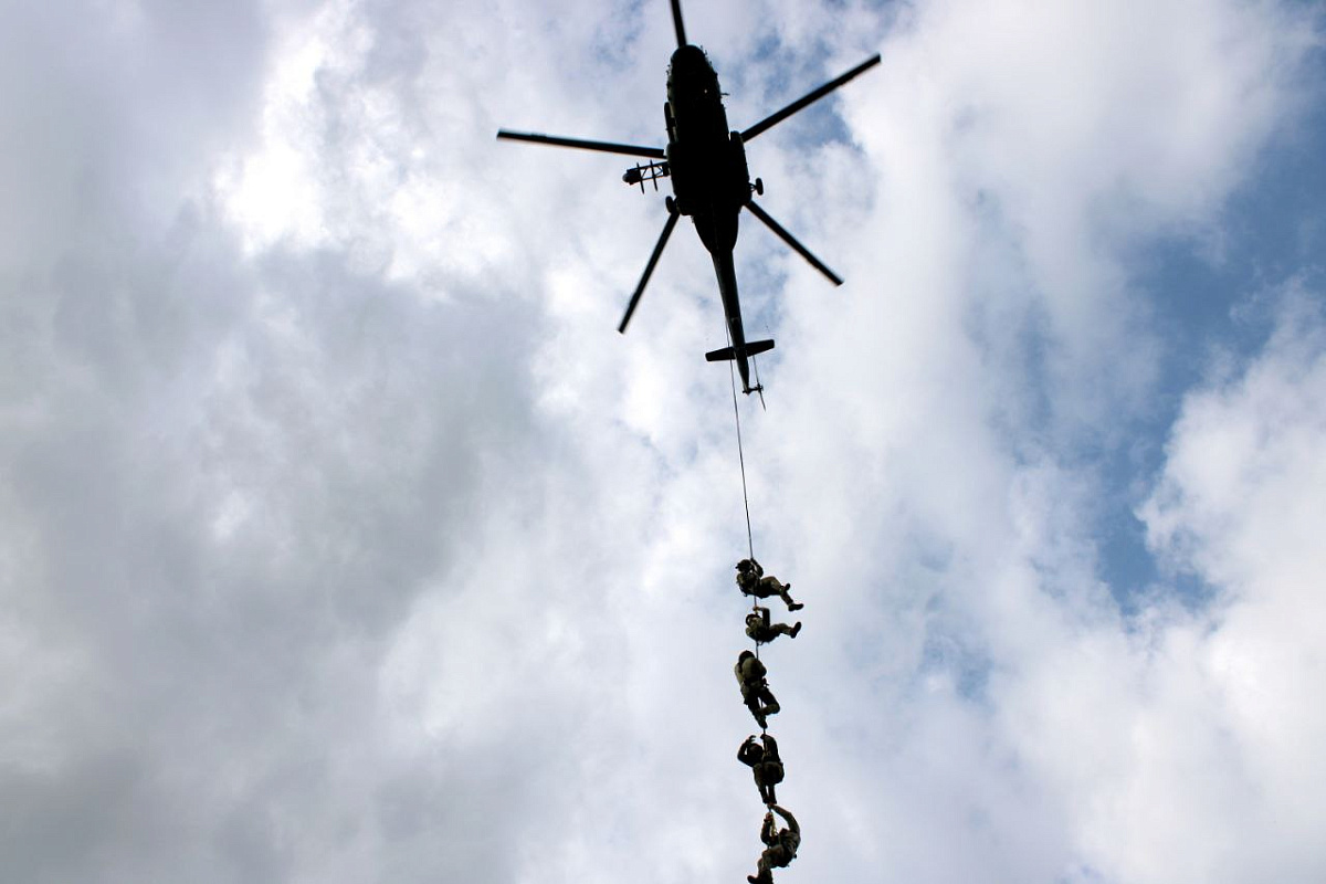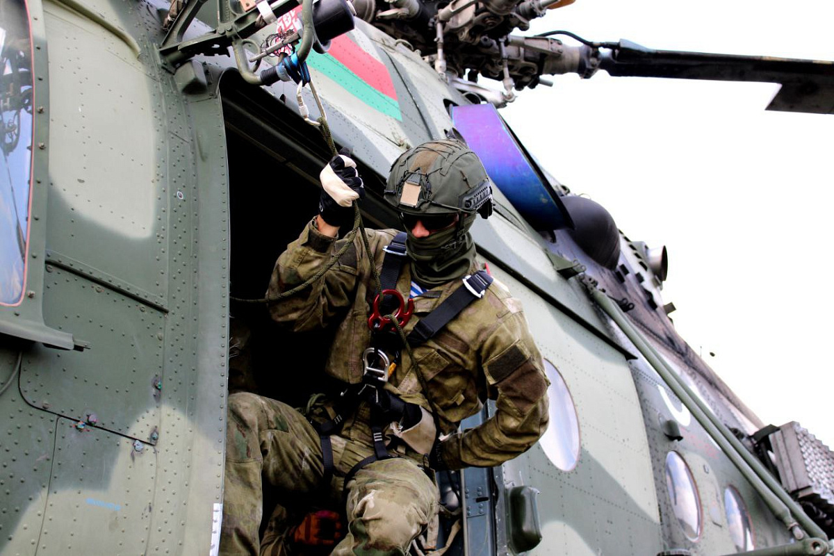 Военнослужащие 5-й отдельной бригады специального назначения отработали десантирование из вертолета Ми-8МТВ-5 с использованием альпинистских веревок и специального десантного каната.