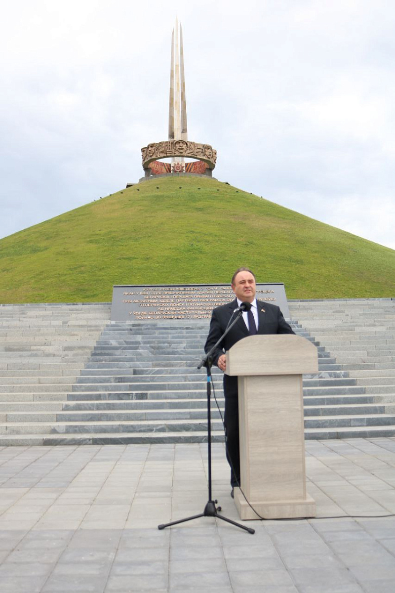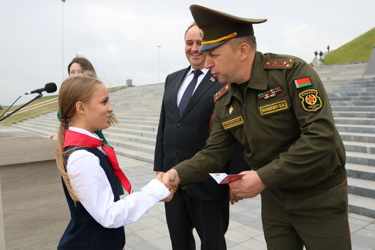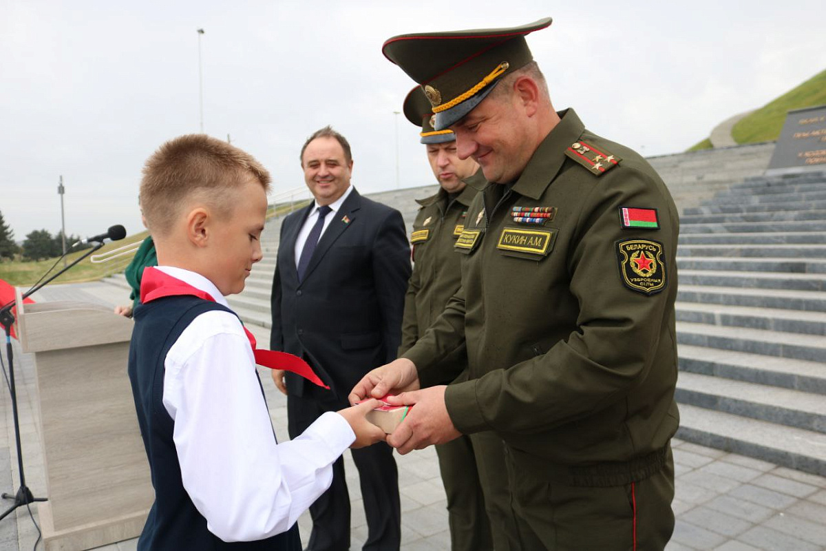 В мемориальном комплексе «Курган Славы» учащиеся гимназии №1 г. Жодино торжественно вступили в военно-патриотический клуб «Волот», который основан на базе 65-й автомобильной бригады.