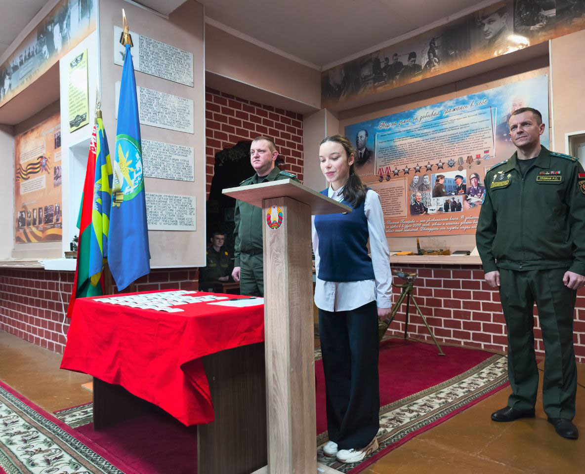 В комнате боевой славы 116-й гвардейской штурмовой авиационной базы состоялось мероприятие по приему в пионерскую дружину имени А.В. Ничипорчика и Н.Б. Куконенко учащихся средней школы № 13 города Барановичи.