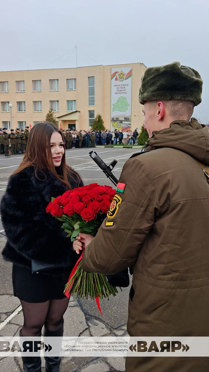 А для рядового Матвея Мегутя этот день стал важным вдвойне. На плацу, под взглядами друзей и родственников, он не только произнес важные слова Военной присяги, но и предложил своей девушке Злате стать его женой. Они встречаются уже четыре года, вместе учились в Молодечненском государственном политехническом колледже. Сдерживая слезы радости, девушка ответила «Да», а военнослужащие и гости поздравили Матвея и Злату аплодисментами.
