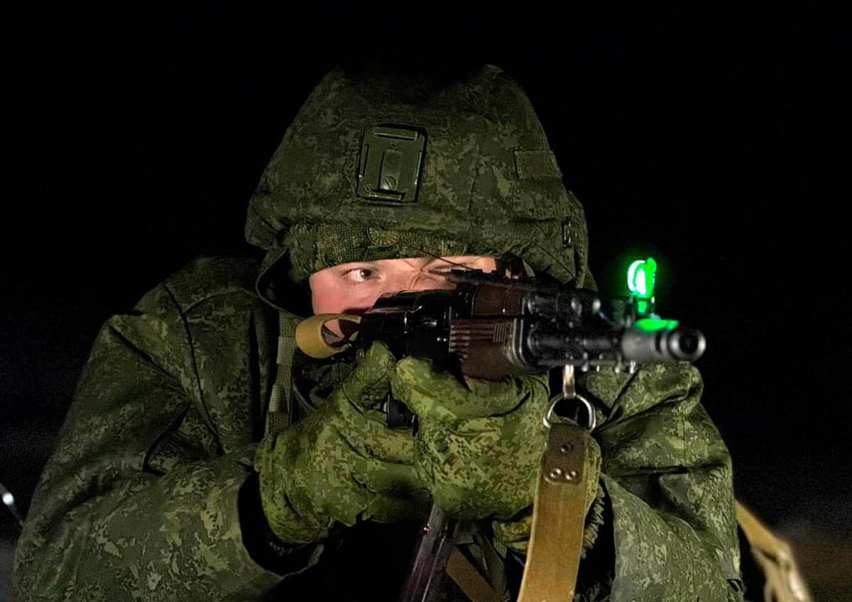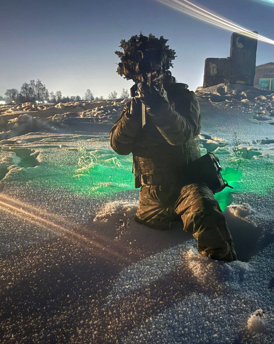 Спецназовцы 5-й отдельной бригады специального назначения и воины-связисты 85-й бригады связи выполняют упражнения по огневой подготовке в ночных условиях.