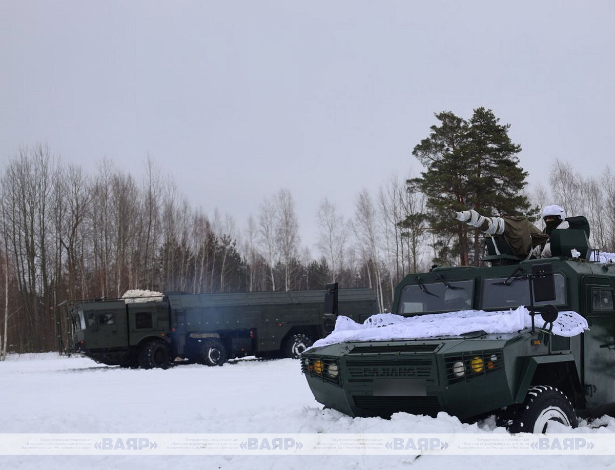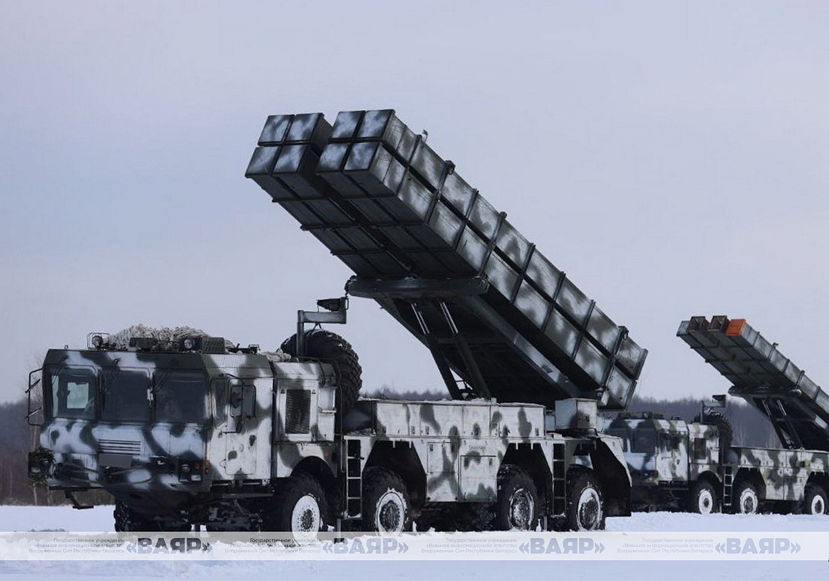 В условиях лесисто-болотистой местности действуют расчеты реактивных систем залпового огня «Полонез-М» и оперативно-тактического ракетного комплекса «Искандер-М».
