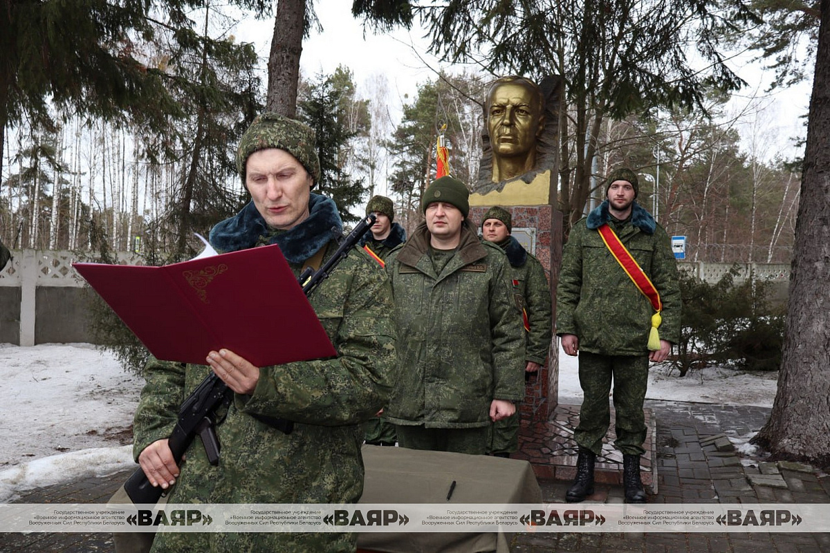 В торжественной обстановке клятву на верность Республике Беларусь произнесли четыре военнообязанных. Священный воинский ритуал прошел в знаковом для воинского коллектива месте – у памятника Герою Советского Союза генералу Дмитрию Михайловичу Карбышеву. Недавно, 18 февраля - дата, когда генерал шагнул в бессмертие, - прошел день памяти Героя. А сегодня с него берет пример новое поколение защитников Отечества.