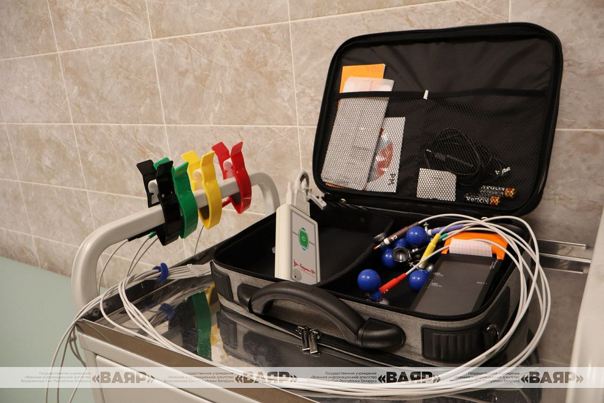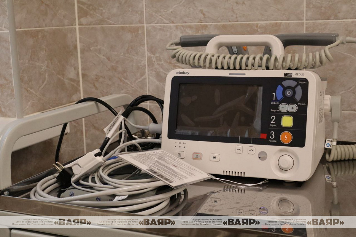 Медпункт оснащен новой мебелью и современным медицинским оборудованием: портативными электрокардиографом и дефибриллятором, кислородным концентратором, сейфом-термостатом и паровым стерилизатором. К слову, при необходимости здесь могут проходить стационарное лечение одновременно 40 военнослужащих.