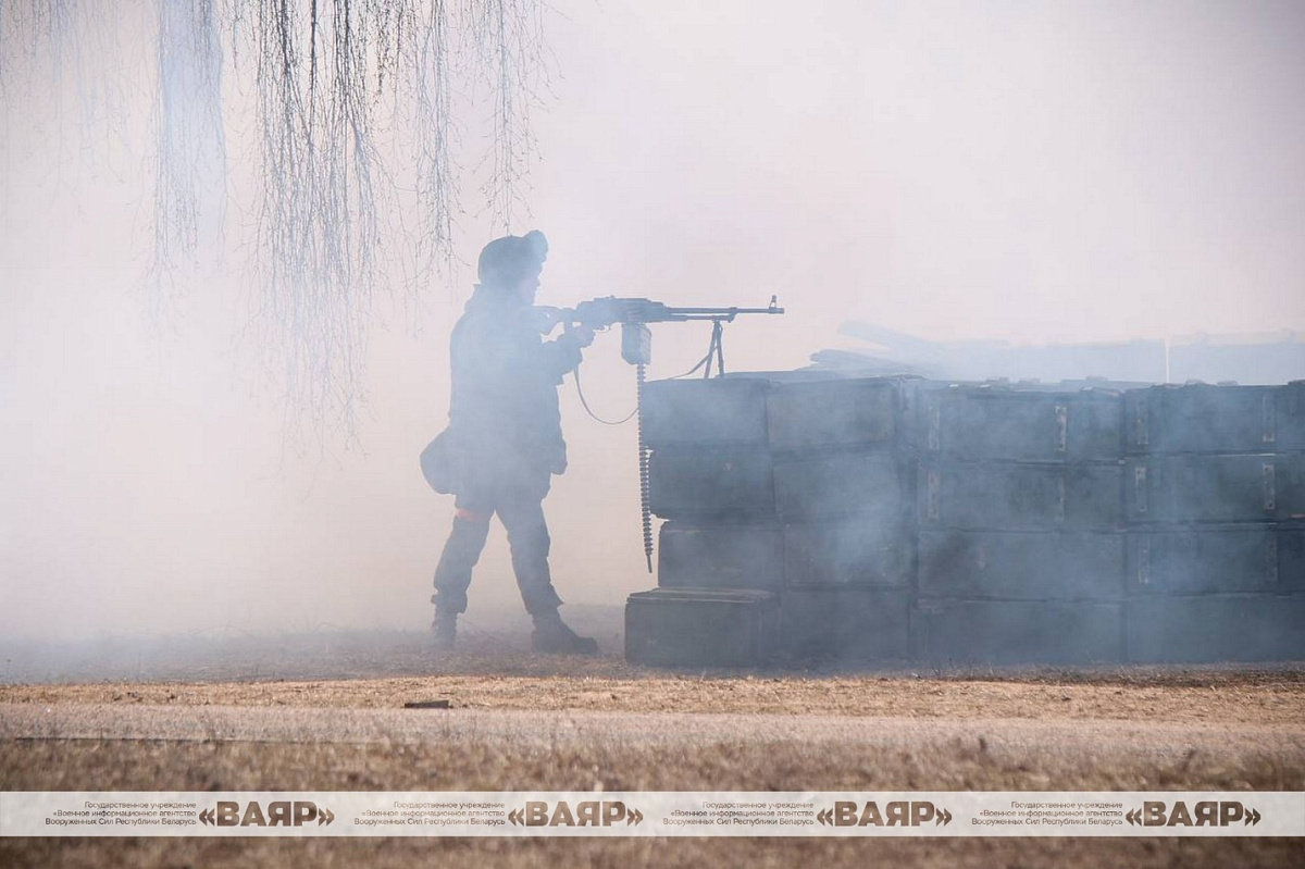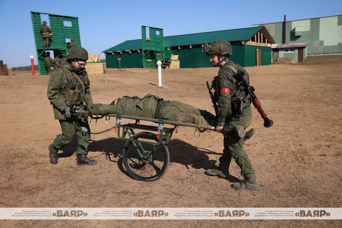 Под прикрытием боевых машин пехоты и дымовых завес личный состав отрабатывает слаженные действия по оказанию первой помощи и эвакуации раненых с поля боя.