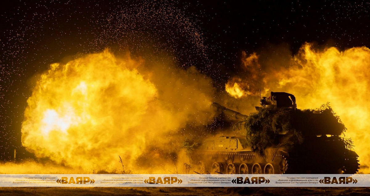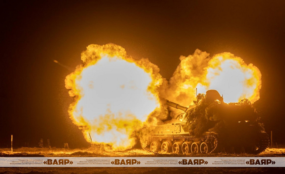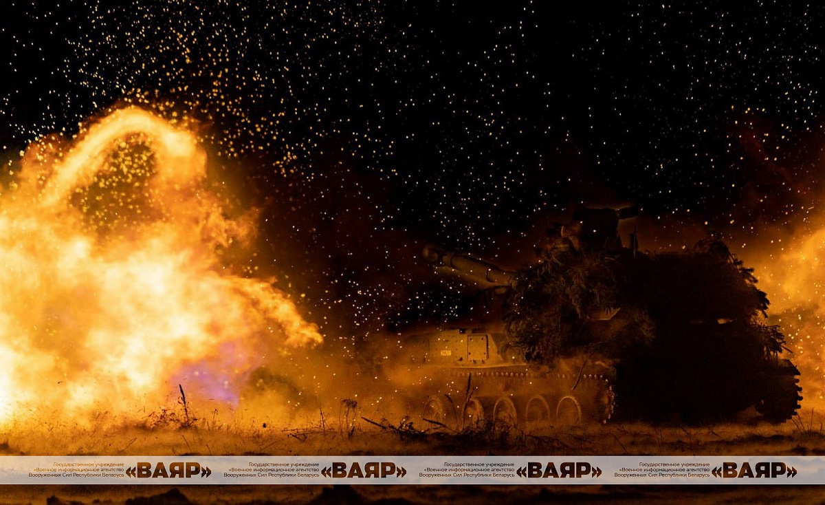 Военнослужащие ведут огонь из орудий артиллерийских установок 2С1 «Гвоздика» и 2С3 «Акация», поражая цели на различной дальности.